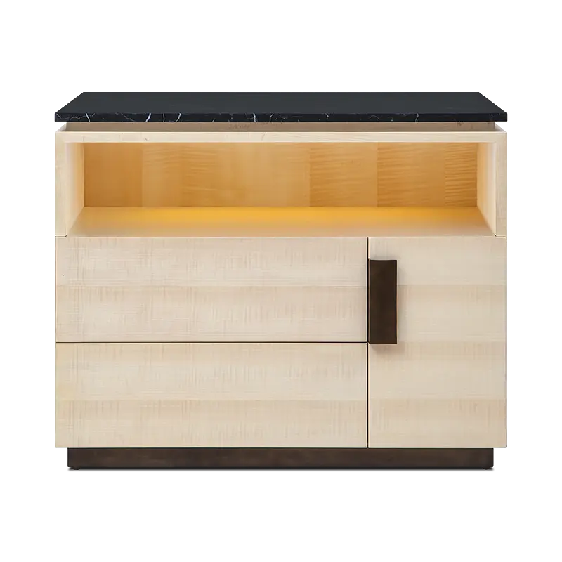 A stunning nightstand with contemporary styling. Hand crafted with an asymmetrical side-opening door, two drawers and a backlit shelf compartment, this striking piece also features an inset base and Nero Marquina Marble top.