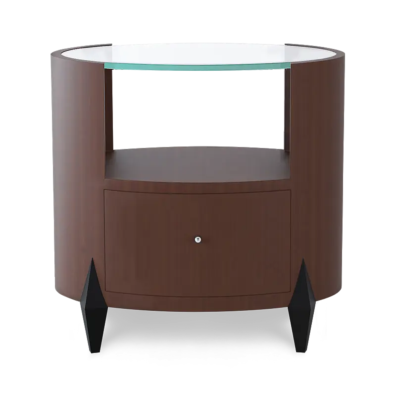A beautifully crafted classic oval mahogany nightstand with feature glass inset top and diamond shaped feet. The single drawer under an open compartment is lined in ultra-suede and the dimension makes this the perfect nightstand for most bedroom settings.