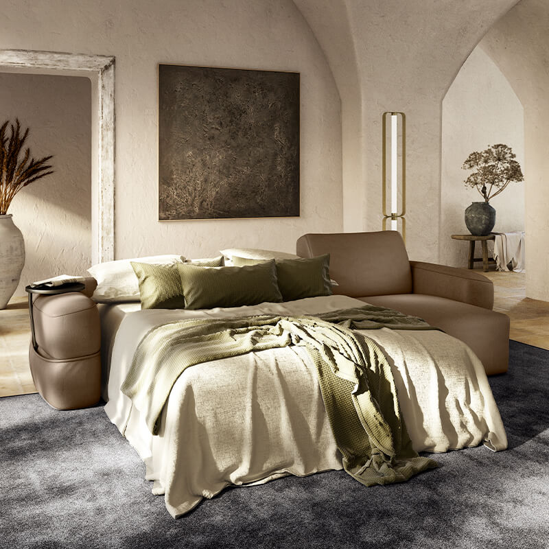 Easy was born from the need to have an easy-to-use product with a "ready-to-bed" mechanism without renouncing the comfort typical of a sofa without functions. The modern, rounded style gives it unparalleled visual comfort.
