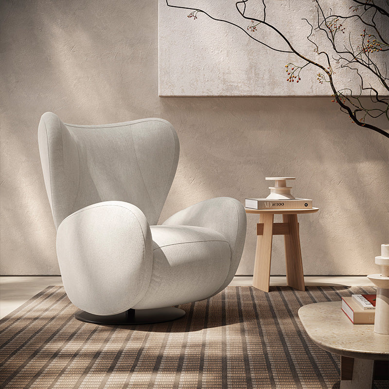 A comfortable armchair with a simple, enveloping design featuring a metal swivel base. Fiorita with its contemporary look furnishes both domestic and professional environments with style.