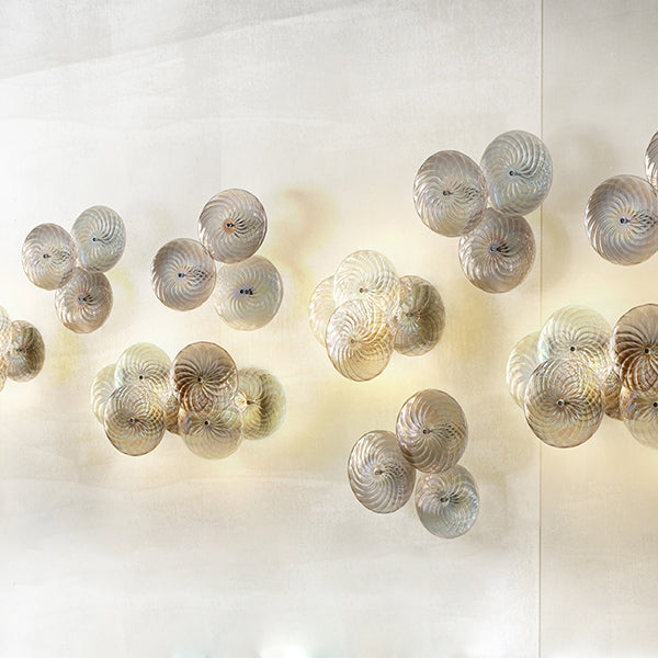 A graceful suspended glass element that can be massed to play with spaces – to be a room divider, to hide a column or to embellish a wall, HIME can be lit from above, from below and/or from the side to bring out the magical effects of light on the surface of each glass.