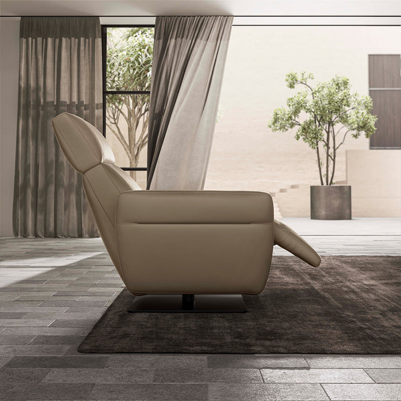Lenny armchair features a contemporary design, characterised by a high backrest and generous seat. The compact armrests enhance the model, distinguishing its modern, essential design. Its swivel base facilitates movement during relaxation.
