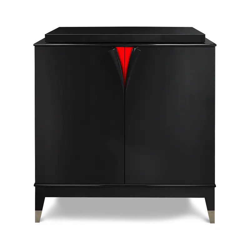 An elegant chest or bedside table with metal finish tipped feet, displaying hand-carved scroll work forming the handles in a fan design. Opening with twin front doors, inside is a drawer, pull-out tray and two separate interior spaces, delivering utility in a graceful and alluring form.