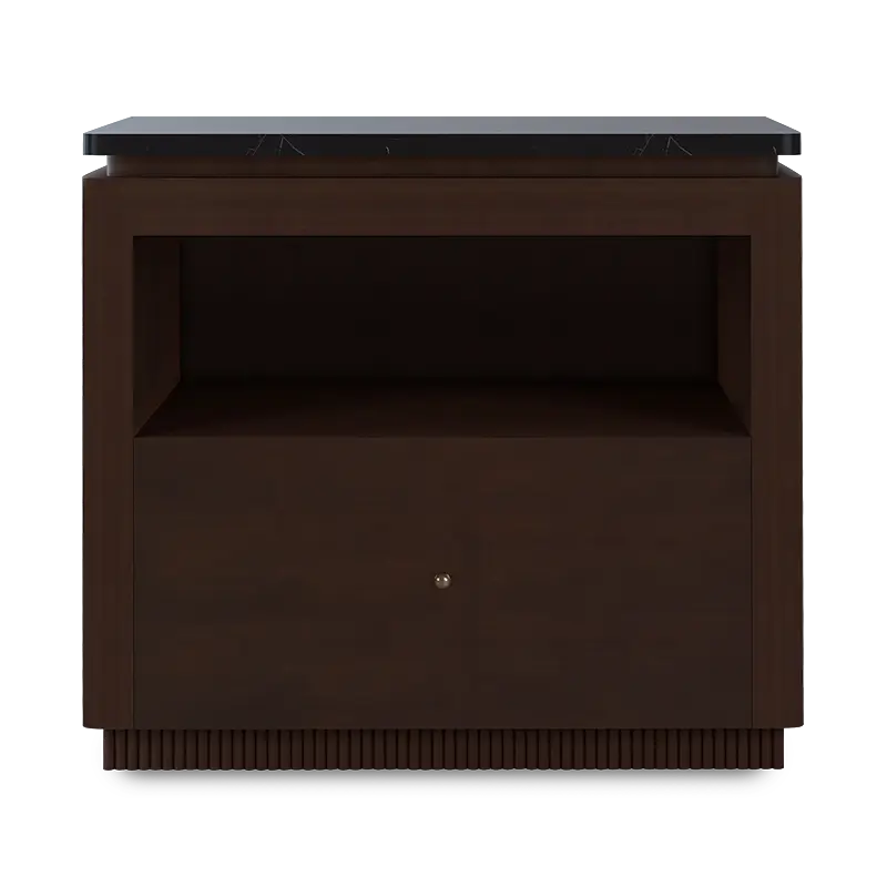 A classic mahogany nightstand with marble top in stunning Nero Marquina and feature ribbed base. The single drawer under an open compartment is lined in ultra-suede and the dimensions make this the perfect nightstand for most bedroom settings.